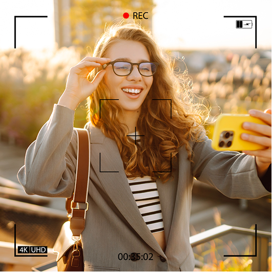 You just say the command. The glasses snap the photo through the built in camera and save